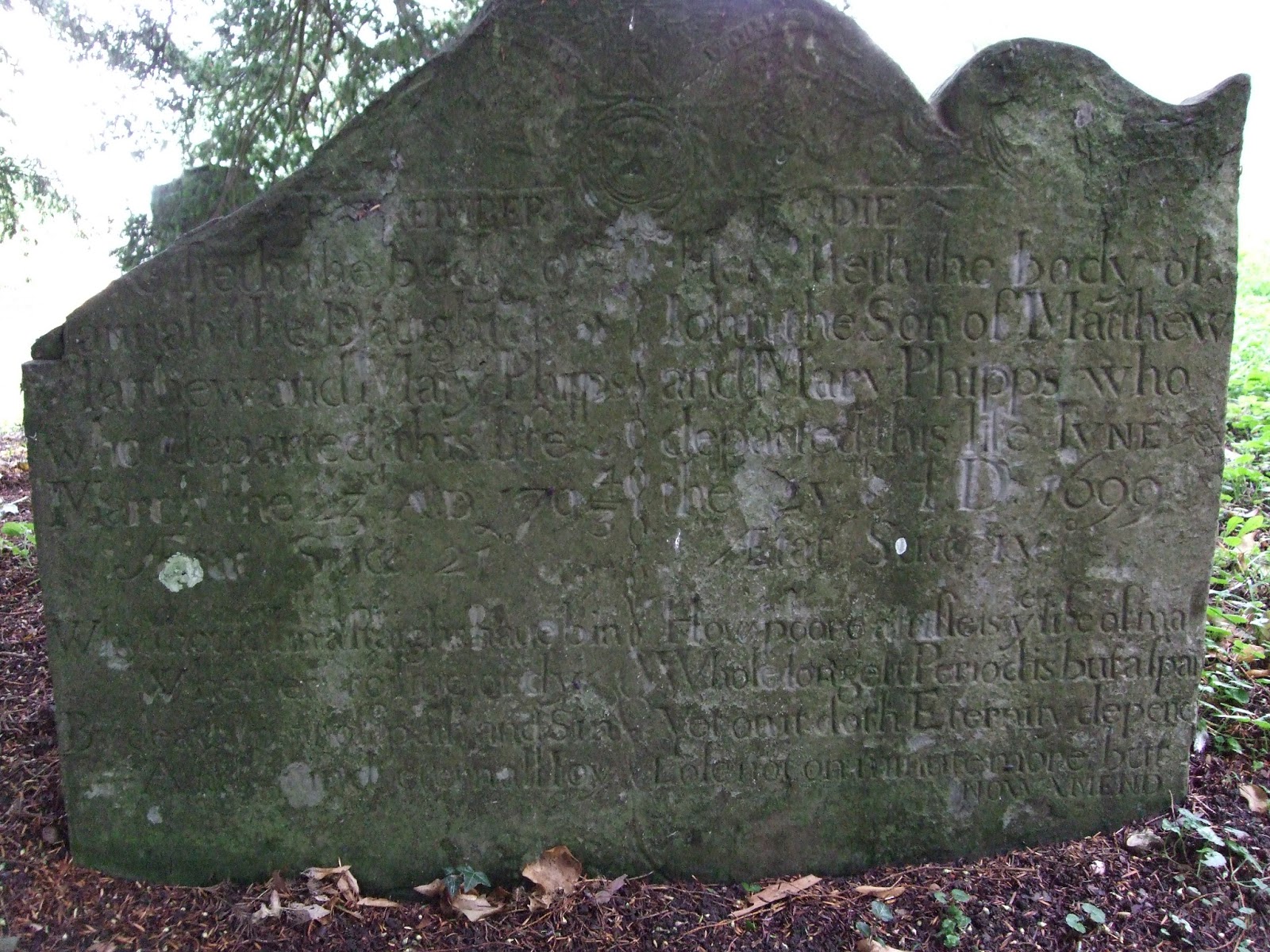 This stone beside the church path was erected for John Phipps, who died in 1699, and Ann Phipps,